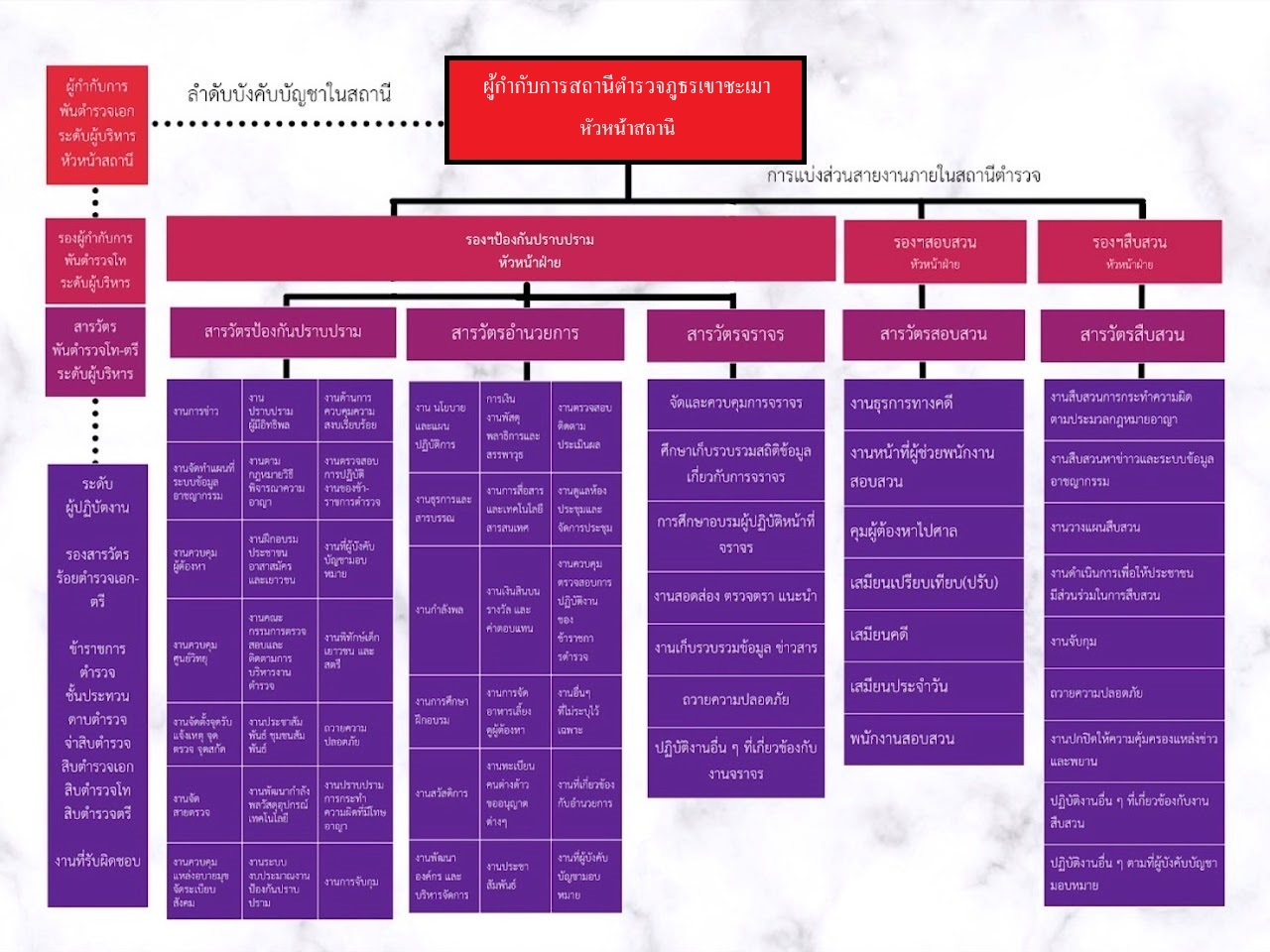 แสดงถึงแผนผังโครงสร้างการแบ่งส่วนราชการสถานีตำรวจ(Organization) ที่แสดงถึงการแบ่งส่วนงานต่างๆ ภายในน่อยงาน